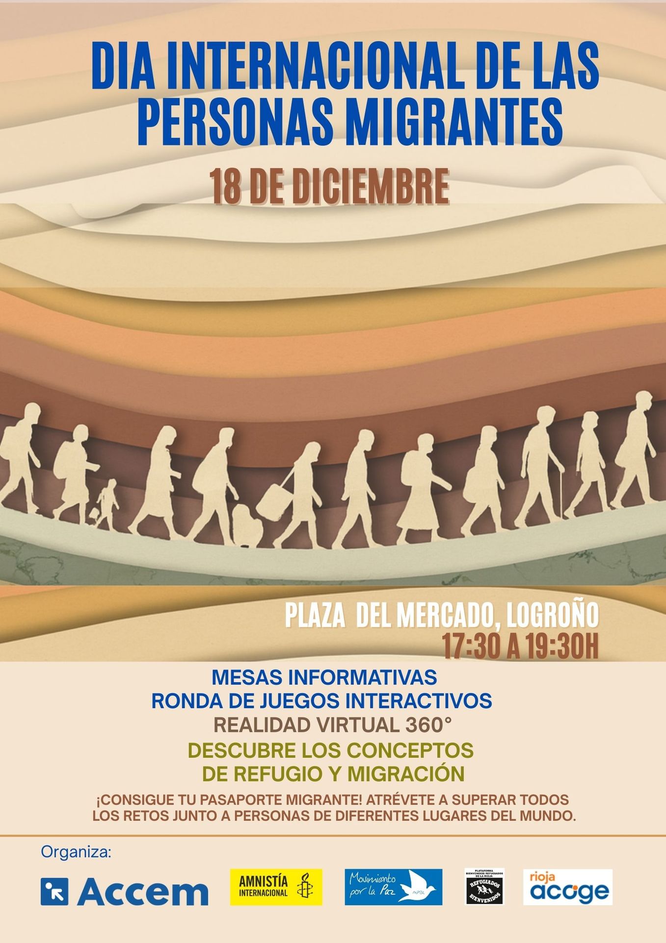 18 de diciembre: “18D. Actividades en la Plaza del Mercado” dinamizado por Rioja Acoge, MPDL, Amnistía Internacional, Plataforma Bienvenidos Refugiados y ACCEM. Contaremos con mesas informativas, ronda de juegos interactivos, realidad virtual 360º. Las personas asistentes podrán superar diferentes retos y conseguir su 'pasaporte migrante'.