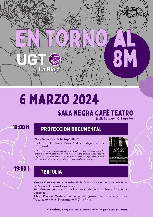 UGT La Rioja, donde se enmarca ISCOD La Rioja, ha organizado el 6 de marzo la proyección del documental ganador de los Premios Goya 2014 'Las Maestras de la República', a las 18 horas en la Sala Negra de Logroño. Tras la proyección, se celebrará una tertulia en la que participará la Asociación para la preservación de la Memoria Histórica ‘La Barranca’, con Marisa Martínez Rioja, así como el PSOE, con el portavoz de la comisión de memoria democrática en el Congreso, Raúl Díaz Marín, y la ex secretaria general de la Federación de Trabajadores de la Enseñanza de UGT La Rioja, Alicia Romero.